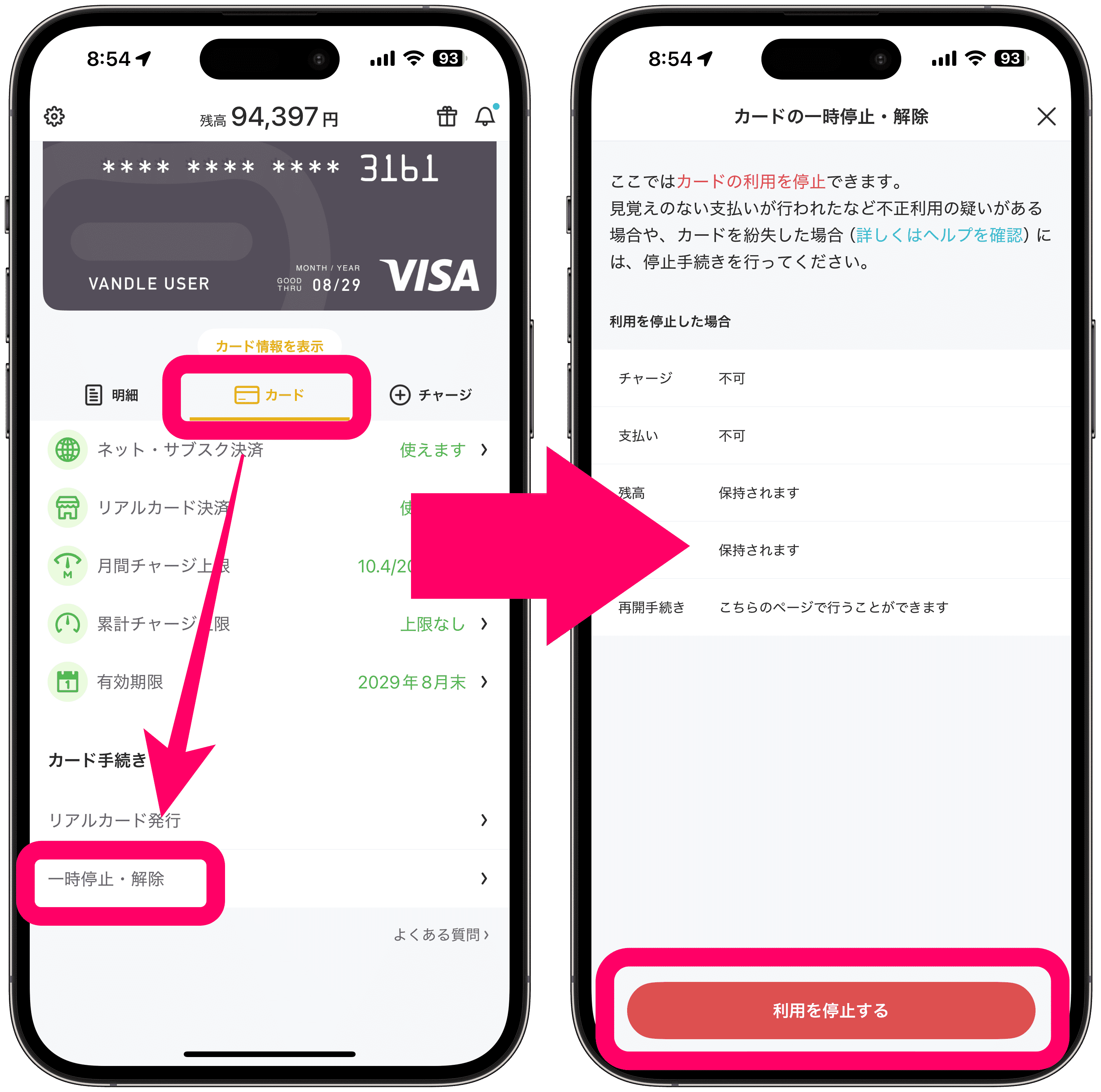 アプリの「カード」→「一時停止・解除」からすぐに手続きできます