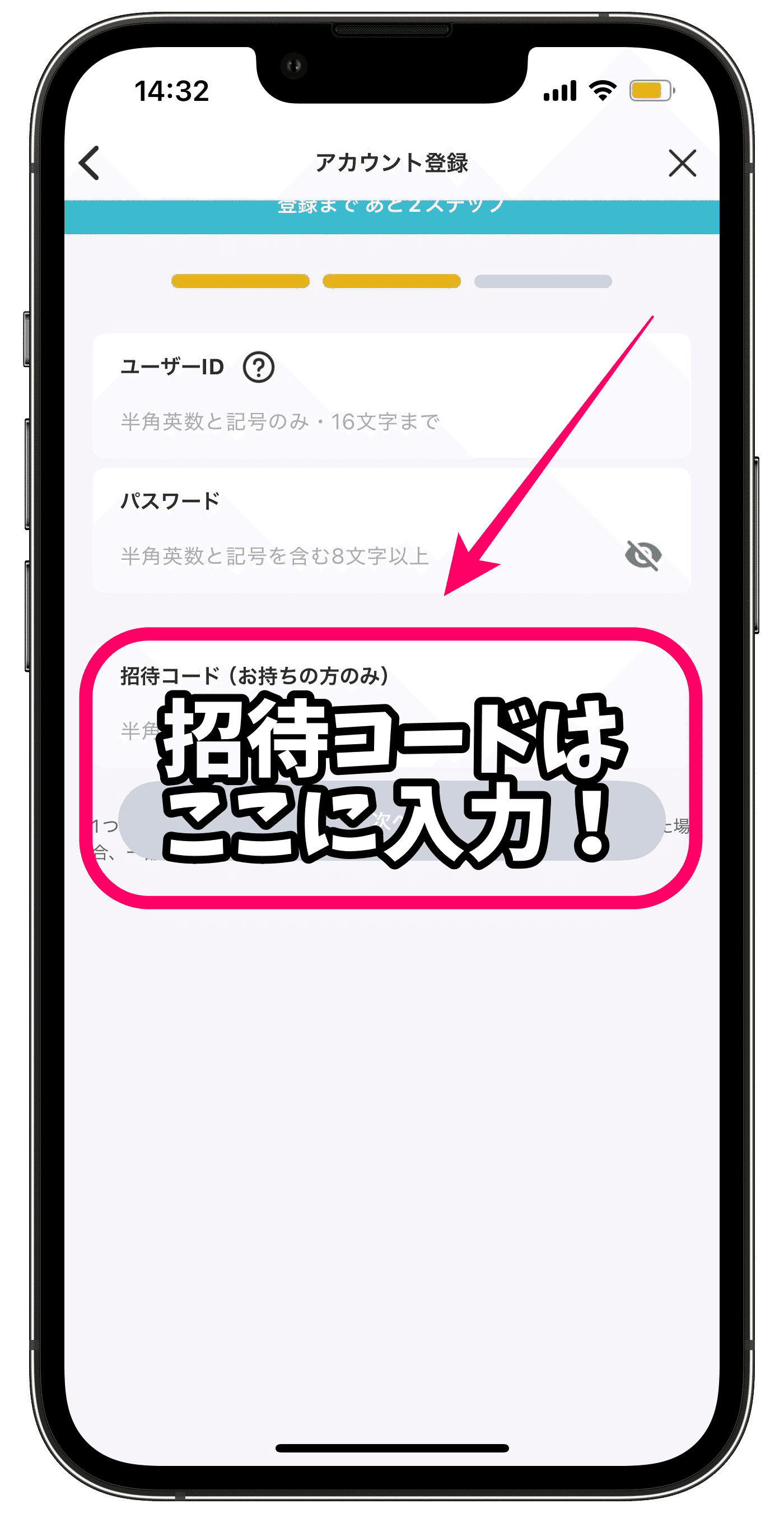 登録時、ユーザーIDやパスワードを入力する画面に「招待コード入力欄」があるので、そこに紹介者のコードを入力します。